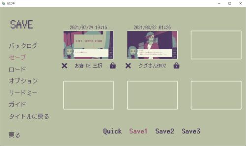 出典元 Making a "Lock Save" action - Lemma Soft Forums 1.pythonを書く options.rpy init python: (省略) if persistent.locked is None: persistent.locked = [] def lockSave(slotname): persistent.locked.append(slotname) if persistent.locked …