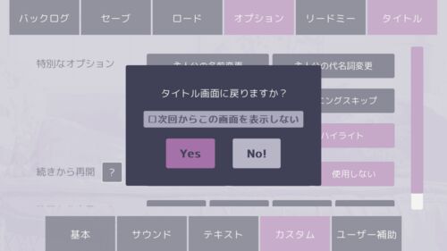 必要な変数を用意 options.rpy default ask = "" default conf = conf1 define conf1 = _("☐次回からこの画面を表示しない") define conf2 = _("☑次回からこの画面を表示しない") define conf3 = ("persistent.ask_save","persistent.ask_del","persistent.a…